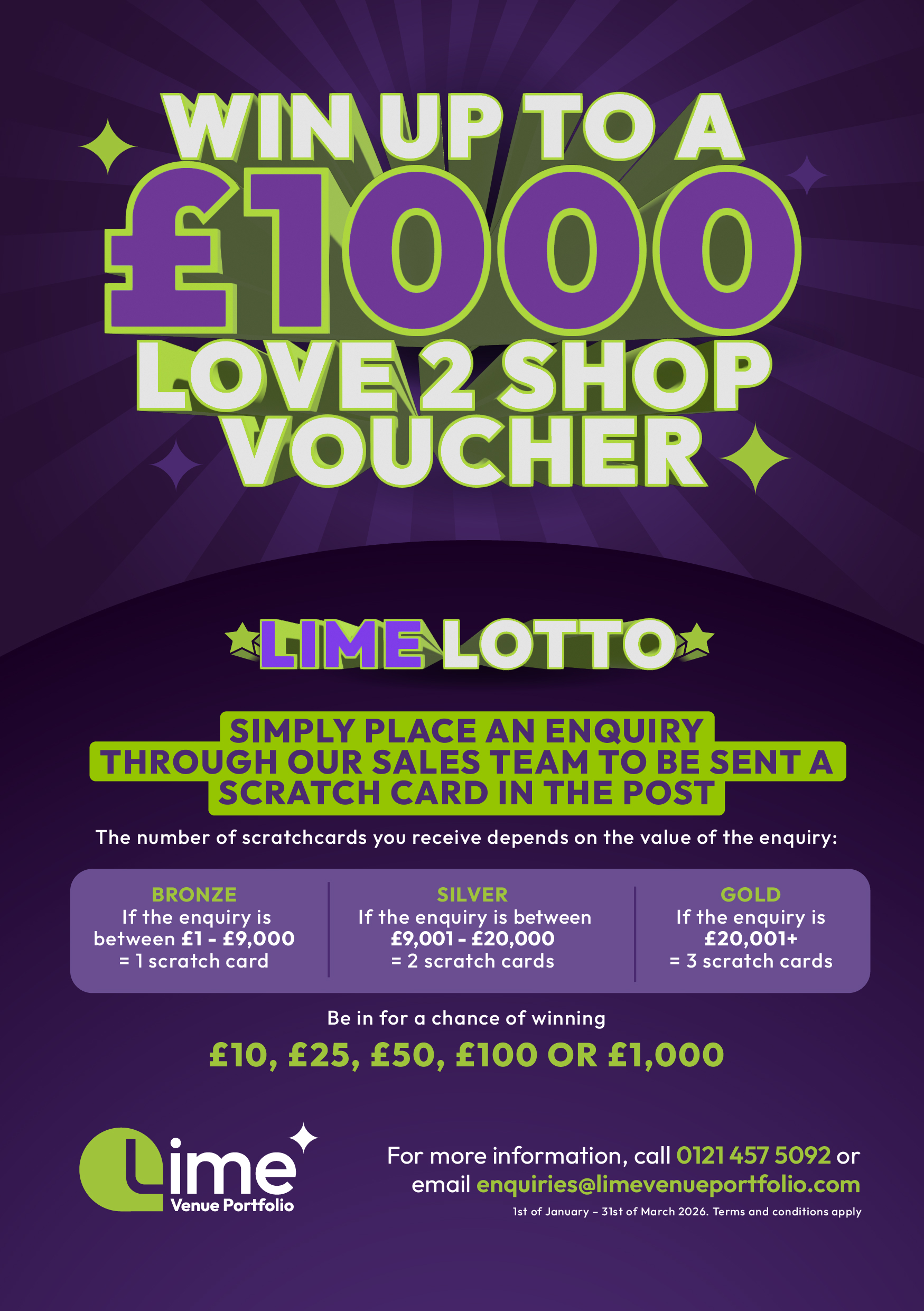 - All event enquiries received by Lime Venue Portfolio will be sent a ‘Lime Lotto’ scratch card(s) in the post to your work address, until such time all lotto cards have been dispatched or the promotion end date, whichever comes sooner. The event(s) can take place at any time, but the enquiry must be placed through Lime Venue Portfolio during the Promotional Period.